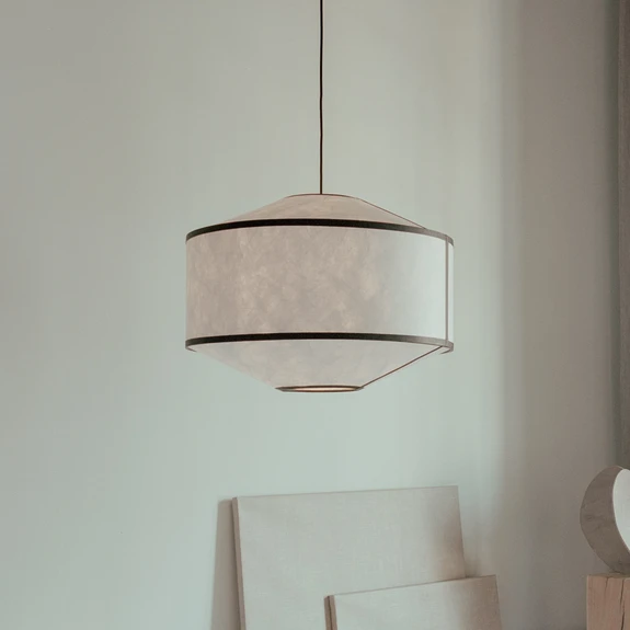 Die 3-flammige Hängeleuchte Kite ist ein Werk der Proportion und Abstraktion, in dem sich reine und geometrische Silhouetten mit glatter, strukturierter Materialität verbinden. Zarte Bänder umranden die Silhouetten, eine technische Raffinesse, die Tiefe und Kontrast bereichert. Im Inneren des Lampenschirms finden sich Fassungen für drei frei wählbare E27-Leuchtmittel (nicht enthalten, siehe Zubehör). Ob zusammen oder einzeln ausgestellt, die Kite Pendelleuchten dienen als leuchtendes skulpturales Element.
