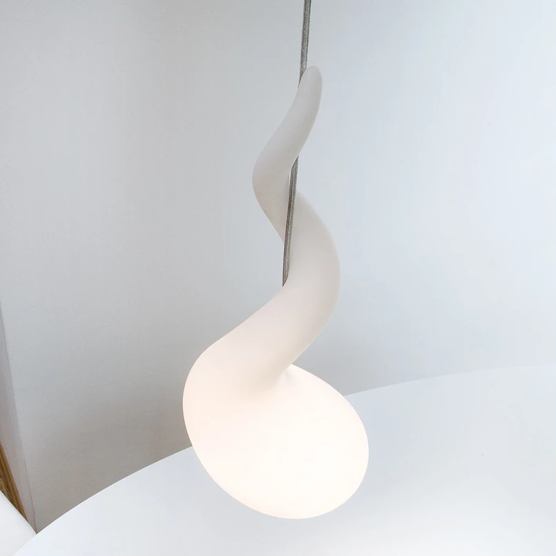 Sanft schmiegt sich eine Art Tentakel um das Textilkabel, das von der Decke hängt, und mündet in einen bauchigen, weißen Leuchtenkörper am unteren Ende des Kabels. Dieser rundliche Körper ist wie auch der schmale Ausläufer in Richtung Decke aus hochwertigem weißem Polyethylen und somit transluzent. Die Transluzenz ist ein entscheidendes Merkmal, da dieser weiße Kunststoffkörper als Lampenschirm bzw. Diffusor dient. Völlig entblendetes und sanft gestreutes Licht spendet die Pendelleuchte mit dem Namen Alien - ein passender Name für ein solch fremdartiges Gebilde, das sich mit gewöhnlicher Begrifflichkeit kaum beschreiben lässt.