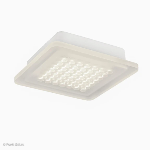 Die Bauform und Farbgebung der Deckenleuchte Modul Q 49 mögen zunächst kühl wirken. Der moderne Lichtspender ist jedoch bewusst minimalistisch gestaltet, wobei bei diesem Konzept nicht auf vorteilhafte Funktionalitäten verzichtet wurde. In der mattierten Diffusorfläche sitzen 49 LED-Lämpchen hinter je einer kegelförmigen Öffnung. Durch den Aufsatz der Acrylplatte ergibt sich eine Lichtverteilung, die eine sehr gleichmäßige, nahezu raumhohe Wandaufhellung durch Sekundärlicht und eine Deckenaufhellung bewirkt. Das Modul wird mit einem integrierten Konverter zum Anschluss an 230 Volt-Deckenauslässe geliefert.