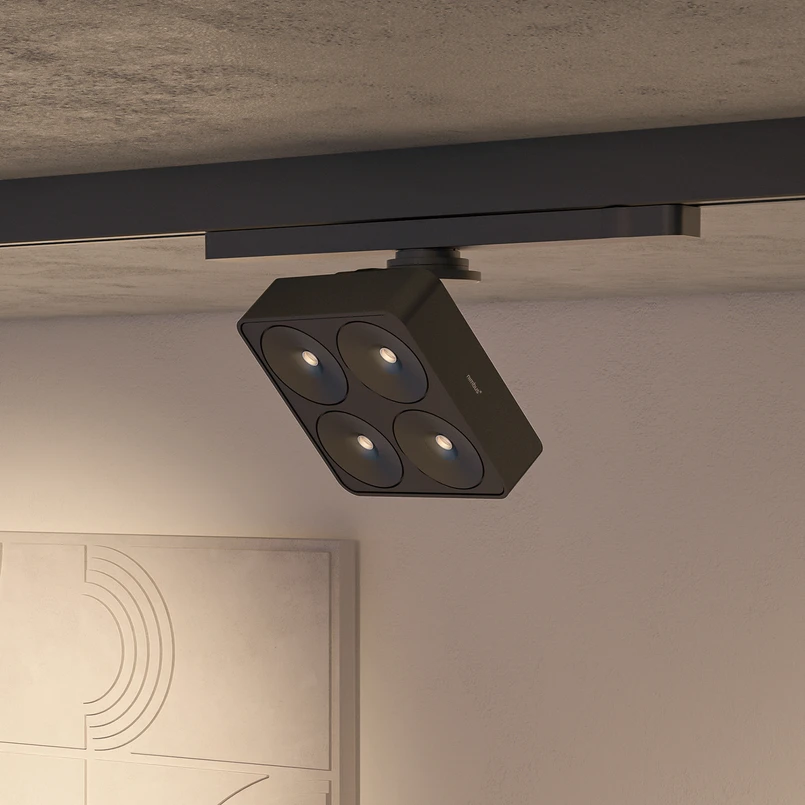 Q Four TT Track ist ein beweglicher Lichtspender, der mit Standard-3-Phasen-Stromschienen kompatibel ist. Seine cleane, minimalistische Gestaltung lässt sich nahtlos in moderne Raumkonzepte einfügen. Doch die Leuchte überzeugt nicht nur durch Optik. Das wohl prägnanteste Attribut ist die Beweglichkeit des Moduls. Der Strahler lässt sich um ca. 335° drehen und 60° schwenken. In Kombination mit den eng gewählten Winkeln der Lichtaustrittsöffnungen sorgt Q Four TT Track für eine zielgerichtete Raumbeleuchtung.