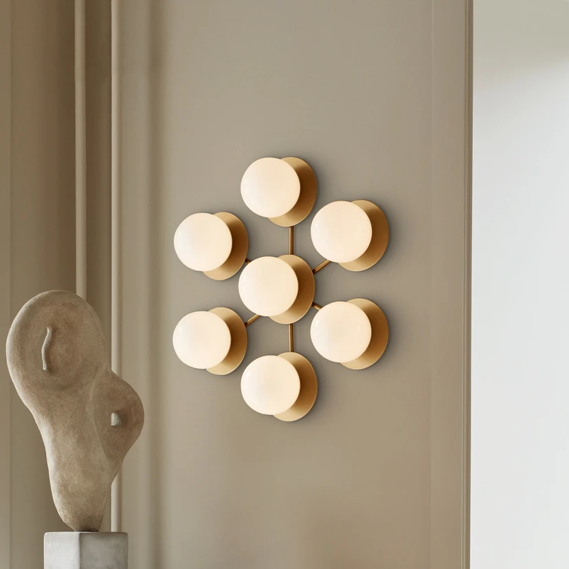 Die Wandleuchte Liila Star besteht in ihren Grundelementen aus sieben kugelförmigen Leuchtenschirmen, die durch Streben aus pulverbeschichtetem Metall sternenförmig angeordnet sind. Die Kugeln sind aus mundgeblasenem Glas gefertigt und entsprechen in ihrer Qualität höchsten Ansprüchen. Der individuelle skandinavisch-minimalistische Look ist eine einzigartige Interpretation des klassischen Kronleuchters. Denn die Leuchte kann alternativ auch als Deckenleuchte genutzt werden, und eignet sich somit hervorragend für Räume mit niedriger Decke.