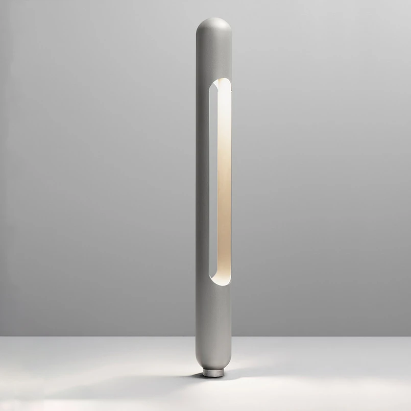 Eine hohe zylindrische Formgebung, komplettiert mit oval abgerundeten Enden, prägt das Design der LED-Wegeleuchte Grounding. Dies zeigt sich sowohl an der äußeren Form des Korpus als auch bei der langen Öffnung im Innern der Leuchte. Hier sind nach unten strahlende LEDs integriert, deren Licht die charakteristische Formgebung der Wegeleuchte betont und die Umgebung zu beiden Seiten blendfrei erhellt. Dank der herausragenden Farbwiedergabe (CRI 97) werden die Nuancen der Gestaltung der Wegeleuchte und anderer Objekte in der unmittelbaren Umgebung hervorragend inszeniert. Ein Montagesockel zur Verankerung im Untergrund ist separat erhältlich (siehe Zubehör).