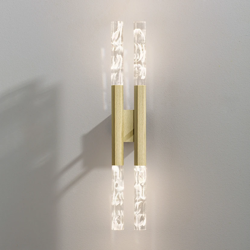Mit der Verwendung von Messing als Hauptmaterial erhält Shine Plumage einen edlen Charakter. Vor der rechteckigen Wandhalterung sind zwei hohe, hexagonale Prismen angebracht. Diese sind jeweils an Ober- und Unterseite mit LEDs ausgestattet. Deren Licht wird in Elemente aus klarem Plexiglas gestrahlt. Hier sind echte, weiße Federn eingegossen sind, die das Licht reflektieren und brechen, sodass ansprechende Effekte erzielt werden.