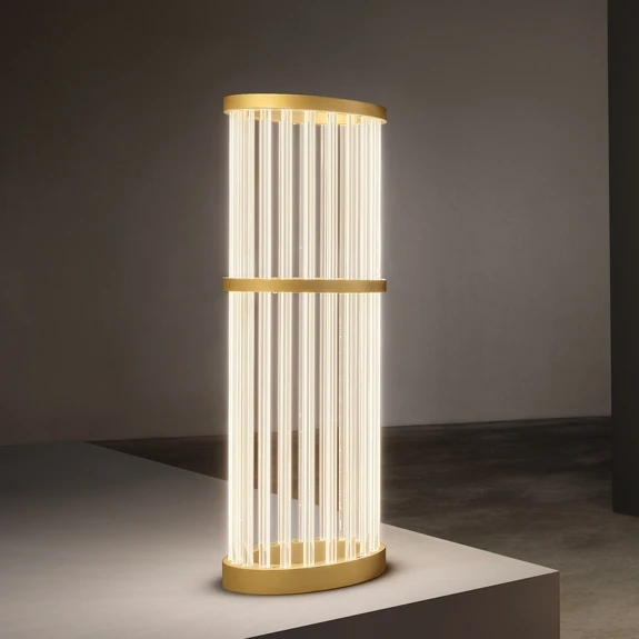 Ein zylindrisches Ensemble aus zahlreichen klaren Plexiglasstäben, eingefasst von Aluminiumringen in edlem Goldfinish - das ist die von der Architektin Elena Ogna entworfene LED-Stehleuchte Thirties. Die Stäbe dienen als Lichtleiter; jeder wird von einer LED erhellt und gibt das Licht auf gesamter Länge in die Umgebung ab. Mit dem Dimmschalter auf dem Steckerkabel kann die Helligkeit entsprechend der jeweiligen Bedürfnisse angepasst werden.