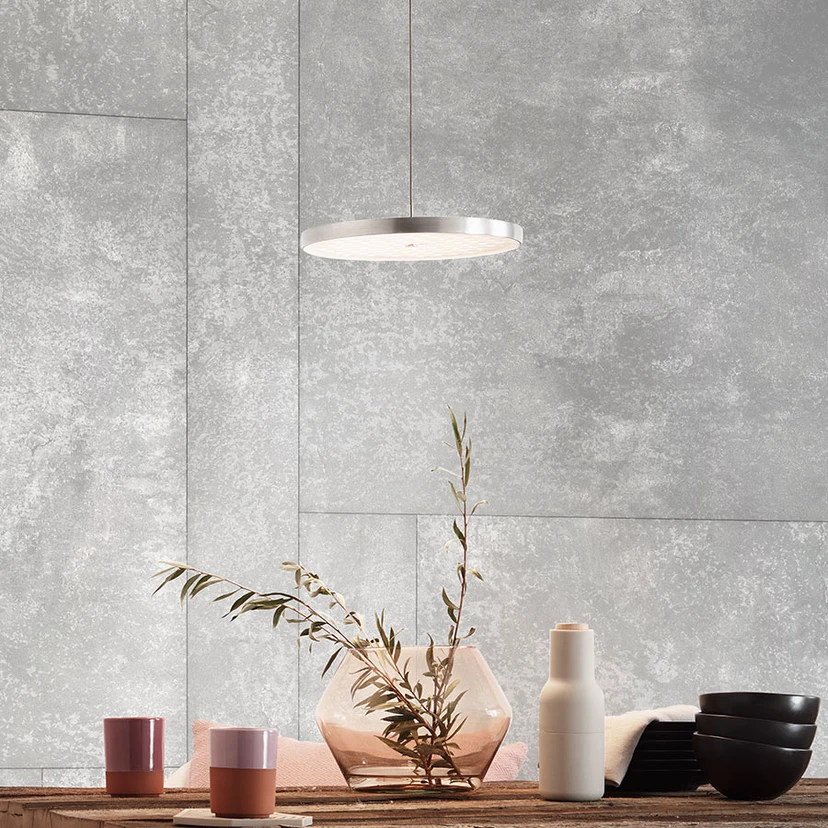 Diese Hängelampe bringt alle Voraussetzungen für eine optimale Raum- und Tischbeleuchtung mit. Der Schirm besteht aus massivem Aluminium und ist auf der Oberseite mit feinen, konzentrischen Linien verziert. Der Diffusor von Decent Max ist mit einer hocheffizienten, vielfach facettierten Prismatik ausgestattet, die für eine sowohl blendfreie als auch weit gestreute Ausleuchtung sorgt. So entsteht eine unvergleichliche Lichtwirkung.