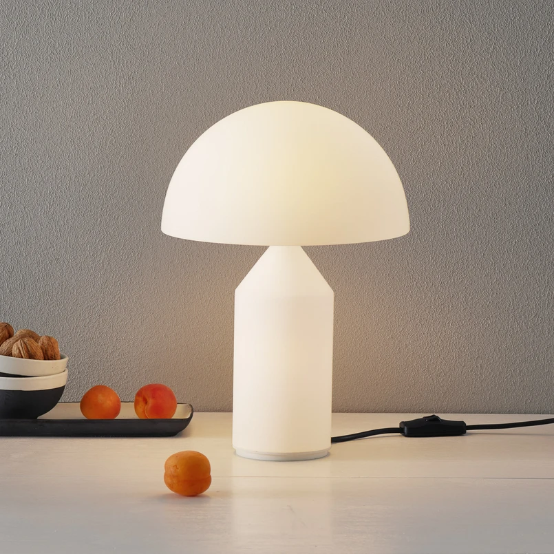 Der erste Entwurf der Tischleuchte Atollo stammt aus dem Jahre 1977. Und auch bis heute hat sie nichts von ihrem Charme verloren. Sie gewann im Laufe der Jahre zahlreiche Preise und ist in vielen Museen der Welt als Designklassiker zu finden. Die Leuchte mit der charakteristischen Pilzform wirkt durch das opalweiße Design und die Verwendung von Muranoglas sehr leicht und unbeschwert. Insgesamt zwei Lichtquellen - eine im Fuß und eine im Schirm - sorgen für direktes und diffuses Licht gleichermaßen. Per Dimmer lassen sich zusätzlich ganz individuelle Stimmungen im Raum erzeugen.