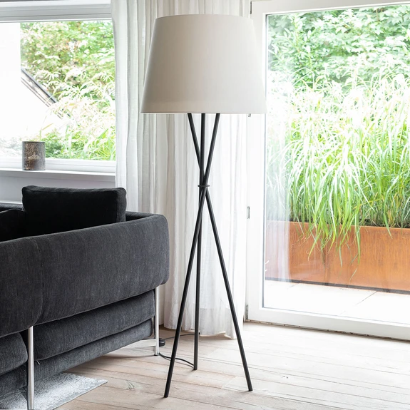 Die Stehleuchte Hailey präsentiert sich als vielseitig kombinierbares Einrichtungselement, das nicht nur als angenehme Lichtquelle glänzt. Sie ist in absolut zeitloser Gestaltung designt; das schlanke, schwarze Dreibein-Gestell trägt einen Textilschirm in Kegelstumpf-Form; die LEDs im Innern sind hinter einem satinierten Acryl-Diffusor integriert. Deren Bedienung erfolgt über den Fußschalter auf dem Steckerkabel.