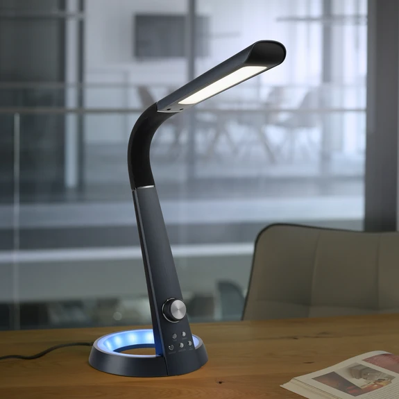 Die LED-Schreibtischlampe Bill punktet zum einen durch ein tolles Design mit rundem, ringförmigem Fuß und einem schön geformten, daran aufragenden Leuchtenarm, zum anderen aber auch durch ihre Flexibilität. Im Leuchtenkopf wurden weiße LEDs verbaut, deren Lichtfarbe sich dank CCT-Steuerung von warmweißer Beleuchtung bis hin zur Lichtfarbe Tageslicht einstellen lässt und die Helligkeit lässt sich über den Drehregler stufenlos dimmen. Im Sockel wurden innen RGB-LEDs integriert, die in den Farben Rot, Grün oder Blau leuchten können, wobei sich ihre Helligkeit mittels Tastdimmer in drei Stufen schalten lässt. Diese Features machen eine Arbeitsplatzbeleuchtung ganz nach den persönlichen Vorlieben möglich. Im Leuchtensockel ist zudem ein USB-Anschluss integriert, so dass das Smartphone oder Tablet direkt an der Leuchte aufgeladen werden kann.