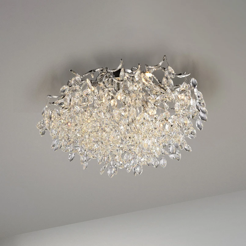 Luxuriös und edel wirkt die Deckenleuchte Ricicle in jedem Raum, ob Wohnraum, Eingangshalle, Hotellobby, Restaurant oder Saal. Die edle, ausladende Leuchte aus glänzend verchromtem Metall ist mit unzähligen Strängen von funkelnden Kristallanhängern bestückt und präsentiert ein atemberaubendes Lichtspiel, das jeden Raum verzaubert. Ihre pompöse Präsenz und exklusive Ausstrahlung machen die Leuchte zum edlen Hingucker in jedem Raum. Die Deckenleuchte ist mit G9-Fassungen ausgestattet, in die neben Halogenlampen auch LED-Leuchtmittel eingesetzt werden können, um in Bezug auf die Energieeffizienz auf dem aktuellen Stand zu sein. Die Glaskristallanhänger reflektieren das Licht auf faszinierende Weise und schaffen eine einladende und schillernde Atmosphäre.