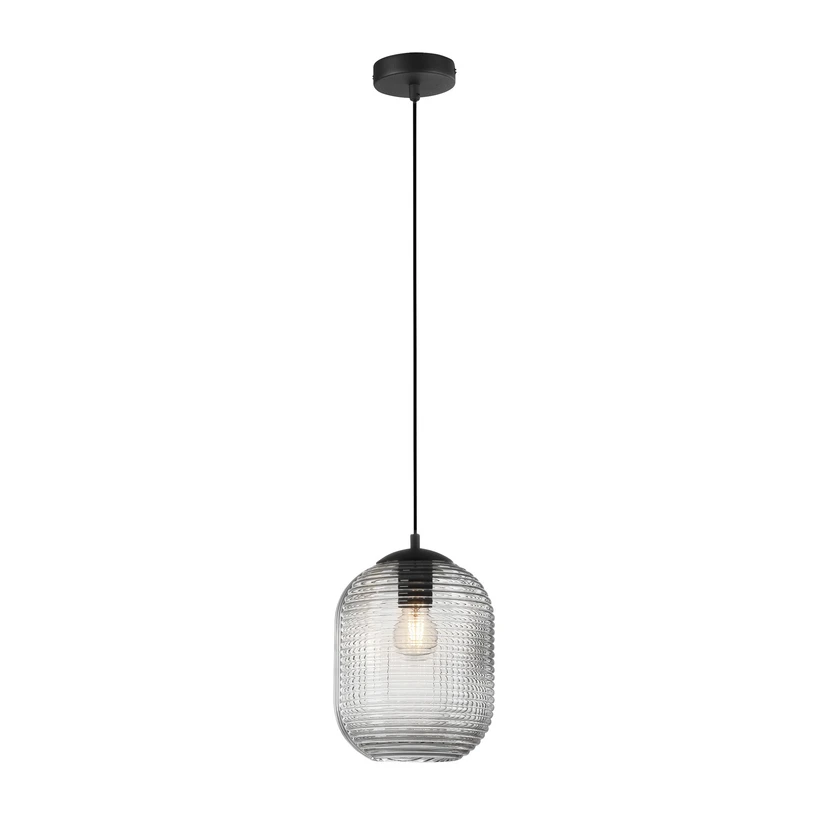 Diese Pendelleuchte hat einen konvex geschwungenen Lampenschirm aus geriffeltem Glas. Dadurch erhalten Ihre Wohnräume ein stimmungsvolles Ambiente. Der runde, schwarze Baldachin hält den gläsernen Lampennschirm. Mithilfe eines Filament-Leuchtmittels unterstreichen Sie den Charakter der formschönen Pendellampe.