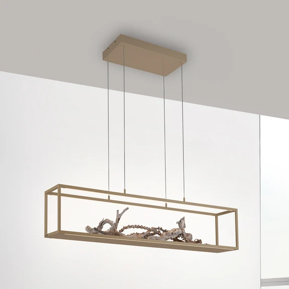 Contura ist eine LED-Pendelleuchte der besonderen Art, denn sie lässt sich mit kleinen Gegenständen effektvoll dekorieren und immer wieder neu gestalten. Der rechteckige, als langer Quader geformte Schirm ist nur am Boden geschlossen, um dort Gegenstände zu platzieren. In den oberen, horizontal verlaufenden Streben wurden warmweiße LEDs verbaut, die nach unten strahlen. Ein integrierter Touchdimmer ermöglicht das Schalten in drei Helligkeitsstufen, die gewählte Helligkeit wird dank der Memory-Funktion bis zum nächsten Einschalten gespeichert. Contura ist eine Leuchte, die überall auffällt und sich immer wieder anders gestalten lässt.