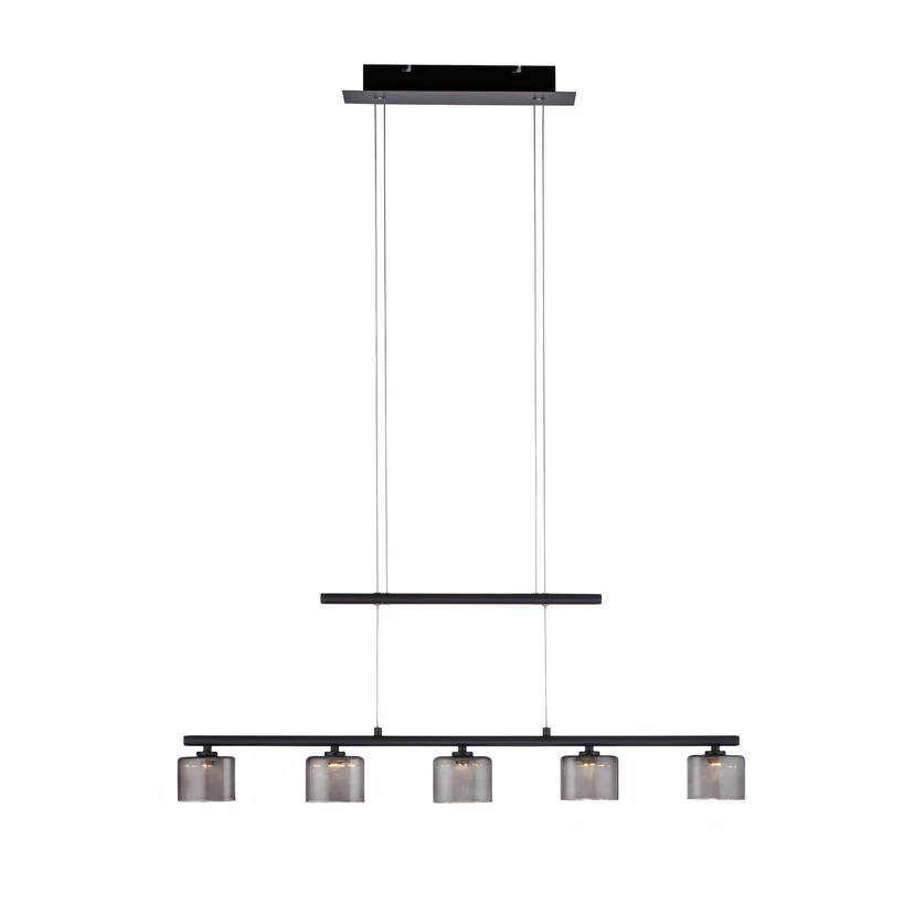 Die LED-Pendelleuchte Hydra ist hervorragend zur Beleuchtung von Esstischen geeignet. Durch das Seilzugkonstrukt lässt sich die Balkenpendelleuchte in der Höhe stets variieren. Die Leuchte wird von fünf Lampenschirmen aus Glas ergänzt. Dadurch wird das Licht sanft in die Umgebung abgegeben ohne zu blenden.