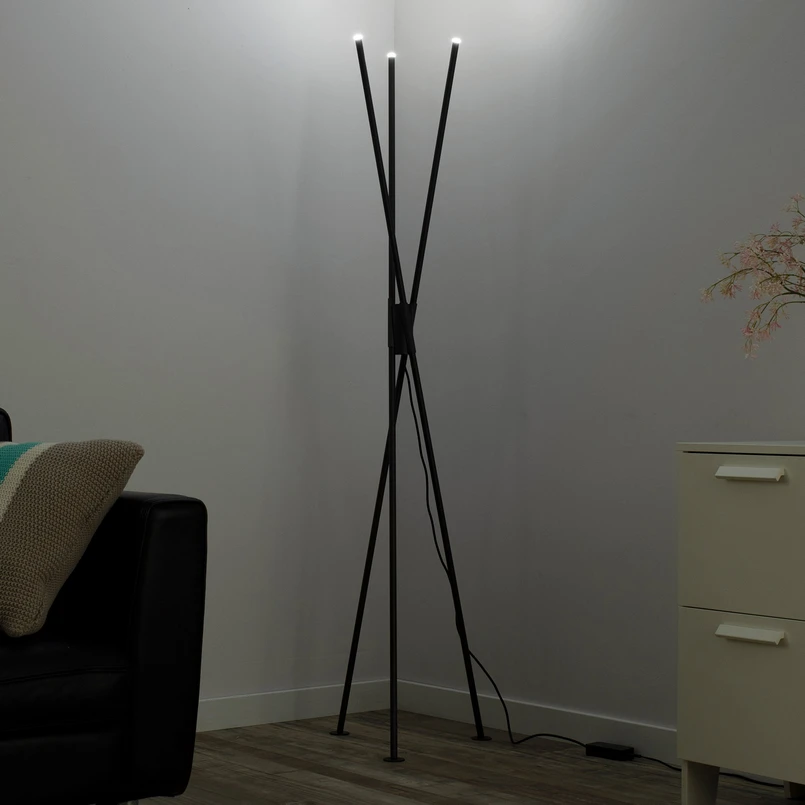 Die LED-Stehleuchte Q-Peter begeistert mit ihrem außergewöhnlichen Design und ihrer intelligenten Lichtsteuerung. Das Gestell bilden drei in der Mitte zusammengeführte Eisenstäbe, die mit einem Finish in Anthrazit umhüllt sind. Die Enden der einzelnen Eisenstäbe sind mit LEDs bestückt, die punktuell leuchten und nicht nur weißes, sondern auch buntes Licht liefern. Die Lichtfarbe kann hierzu einfach über die mitgelieferte Fernbedienung ausgewählt und in der Helligkeit reguliert werden. So lassen sich nicht nur unterschiedliche Lichtszenarien kreieren, sondern auch Lichtstimmungen, die den Tagesablauf simulieren. Dank der Memoryfunktion können die ausgewählten Lichtrezepte gespeichert und bei erneutem Einschalten blitzschnell wiedergeben werden.