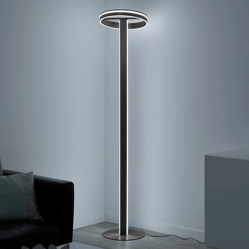 Durch ihr schmales, modernes Gestell fügt sich die LED-Stehleuchte Q-VITO problemlos in unterschiedliche Wohnumgebungen ein. Die schmalen Lichtauslässe sind am Gestell sowie am ringförmigen Schirm integriert und sorgen für angenehmes Hintergrundlicht im Raum. Der Leuchtenschirm kann zudem flexibel geschwenkt werden. Über die beiliegende Fernbedienung sind die praktischen Funktion steuerbar: Es ist möglich, die Stehlampe zu dimmen sowie die Lichtfarbe von warm- zu universalweiß zu verändern. Mit den auswählbaren Lichtszenen werden zu jeder Zeit die optimalen Lichtverhältnisse geschaffen und die Memory-Funktion greift auf die zuletzt gespeicherte Lichteinstellung zurück. Dank der ZigBee-Fähigkeit der Stehleuchte kann sie zudem in entsprechende Smart-Home-Systeme eingegliedert werden. So ist es möglich, Q-VITO auch per App oder Sprachbefehl zu steuern.