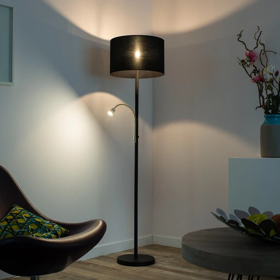 Stehleuchte Robin mit Textilschirm und biegsamem LED-Lesearm