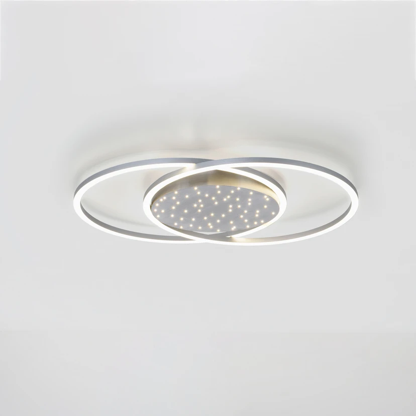 Zwei schmale Ringe wurden bei der LED-Deckenleuchte Yuki überlappend angeordnet, die geschlossene Mitte wurde als Sternenhimmel gestaltet. Unabhängig voneinander lassen sich die LEDs in den Ringen und die im Mittelteil schalten, so dass nur die Ringe nur der Sternenhimmel oder alle Lichtquellen gleichzeitig leuchten. Das CCT-Lichtmanagement macht die Einstellung der Lichtfarbe im Bereich von warmweiß bis universalweiß möglich und die Helligkeit kann zudem stufenlos gedimmt werden. Alle Einstellungen lassen sich bequem über die mitgelieferte Fernbedienung steuern.