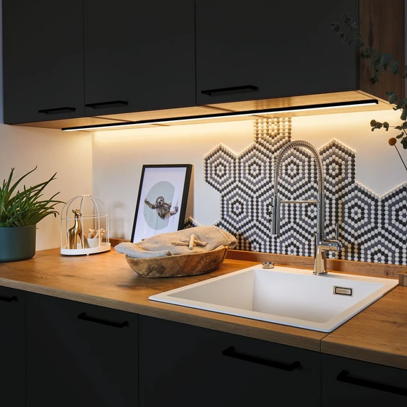 An Möbeln oder Wänden ermöglicht dieses Aluminiumprofil eine homogene Ambientebeleuchtung. Es lässt sich mit einem MaxLED LED-Strip bestücken und bietet durch den satinierten Kunststoffdiffusor eine besonders gleichmäßige Lichtabgabe. Das robuste Aluminiumprofil ist in mattem Schwarz lackiert.