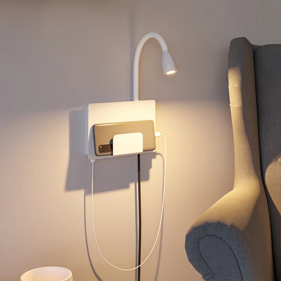 Die LED-Wandleseleuchte Halina ist eine moderne und vielseitige Beleuchtungslösung. Mit einem schwenkbaren, flexiblen Leuchtenarm und einer fest integrierten LED bietet sie punktuelle Beleuchtung für ein optimales Leseerlebnis. Eine praktische Ablagefläche rundet das Design ab. Die seitliche USB Type-C Ladebuchse ermöglicht eine schnelle Ladung von Smartphone und Co. Die steckerfertige Ausstattung mit hochwertigem Textilkabel macht die Platzierung an der Wand unkompliziert und einfach. Das Textilkabel ist abnehmbar und erlaubt den direkten Anschluss an den Stromauslass. Halina eignet sich ideal für das Schlafzimmer oder die Leseecke.