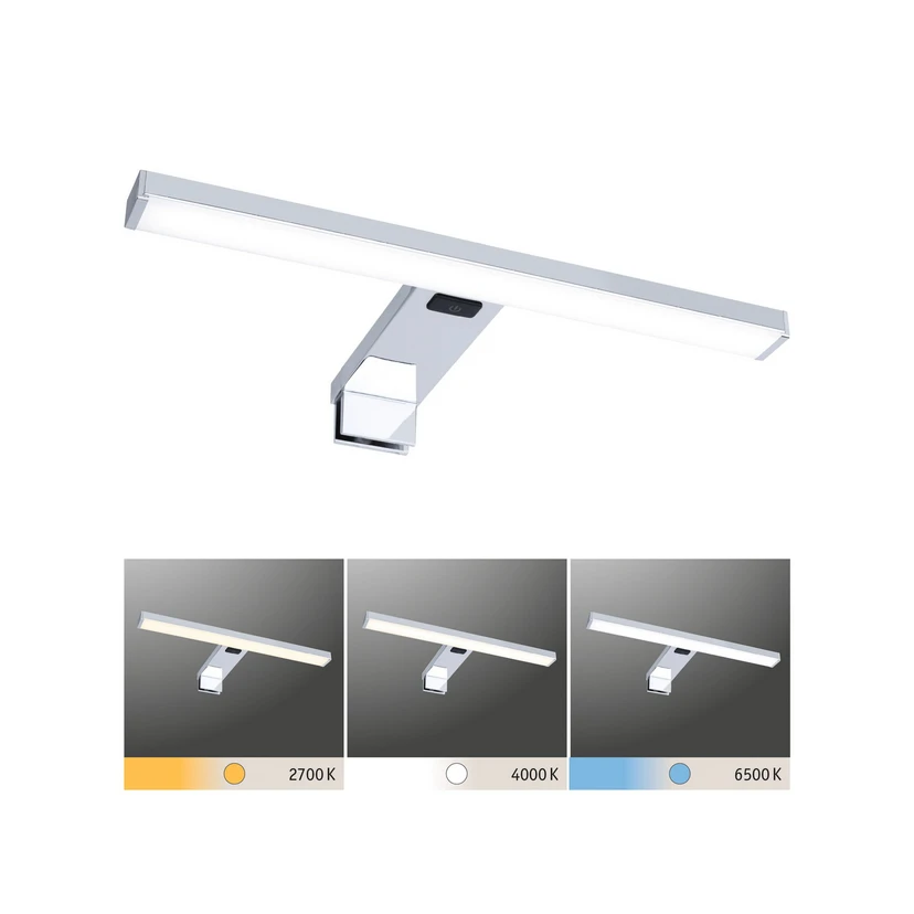 Zu jeder Zeit das passende Licht - ob bei der Morgenroutine, dem MakeUp-Auflegen oder auf dem Weg ins Bett, die Spiegelleuchte Selo ist das ideale Beleuchtungselement über dem Badspiegel. Ihr chromfarbenes Gehäuse passt hervorragend zu zahlreichen Einrichtungsstilen und über den schmalen, länglichen Schirm wird das Licht der LEDs direkt nach unten über die gesamte Breite abgestrahlt. Über den integrierten Schalter lässt sie sich mühelos ein- und ausschalten und auch die Auswahl der Lichtfarbe ist darüber möglich