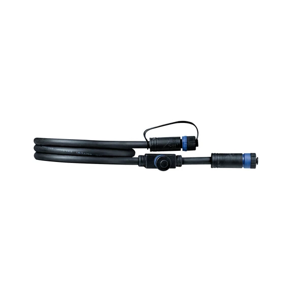 Dieses wassergeschützte, ober- wie unterirdisch verlegbare 24 V-Kabel wird zur Stromversorgung von Plug & Shine Außenleuchten benötigt, die weiter von der Steckdose entfernt liegen. Das Kabel ist mit einem Eingang und zwei Ausgängen ausgestattet; hierfür liegen Abdeckkappen bei. Es kann zum Betrieb von Leuchten mit einer Gesamtleistung von maximal 150 W verwendet werden. Zum Anschluss an die 230 V-Steckdose ist zusätzlich ein separat erhältlicher Außentrafo mit Stecker erforderlich. Verteiler zur Versorgung mehrerer Leuchten können ebenfalls ergänzt werden.