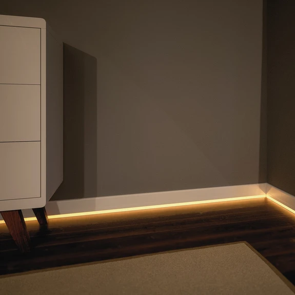 Das Socle Einbauprofil ermöglicht ein blendfreies Orientierungslicht und setzt handelsübliche Fußleisten auf besondere Weise in Szene. Das Profil wird dazu einfach mit der Wand verschraubt und mit einem MaxLED- oder YourLED-LED-Strip bestückt. Nach der Montage des Profils wird die Fußleiste über dem Profil befestigt, so dass diese eine Einheit bilden.