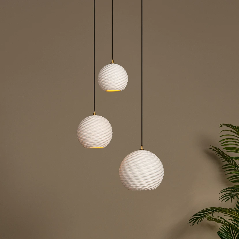Dreiflammige Pendelleuchte Bina mit weißen Porzellan-Schirmen
