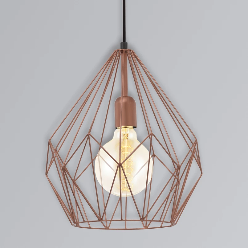 Aus filigranen Stahlstreben in schönem Kupferton besteht der in Käfigform gestaltete, offene Schirm der Pendellampe Carlton. Die Pendellampe wurde im Vintagestil gestaltet und bereichert eben solche Einrichtungsstile, ob in der Küche oder im Wohn- und Esszimmer. Durch den offen gestalteten Schirm ist das Leuchtmittel sichtbar, deshalb wirkt die Pendellampe am schönsten, wenn sie mit einer Globelampe in einer besonderen Optik ausgestattet wird. Unter Zubehör stehen verschiedene Varianten zur Wahl.