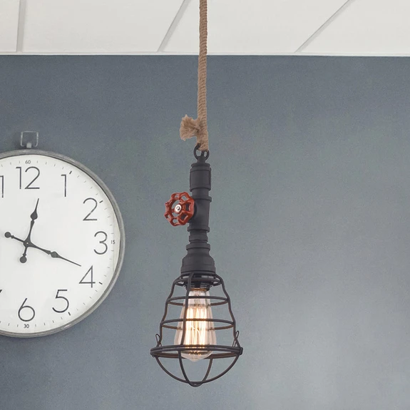 Diese Hängeleuchte besticht durch ihr industrielles Design. Die Aufhängung besteht aus einem dicken Hanfseil, wohingegen der Schirm und die Deckenhalterung aus Metall gefertigt sind. Das kleine Drehventil in Rot sorgt für einen besonderen Eyecatcher und für einen noch originelleren Look. Auch das Leuchtmittel, das von einem massivem Metallkäfig schützend umgeben wird, sollte mit Bedacht gewählt werden, ein dekoratives Leuchtmittel in Kolbenform rundet das Industrie-Design am besten ab (siehe Zubehör).