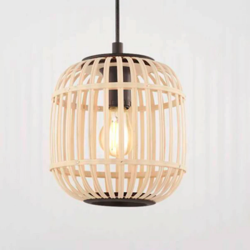 Befestigt ist die Leuchte an einer schwarzen Aufhängung aus Stahl. Der zylindrische, leicht bauchige Lampenschirm in Käfigoptik aus naturbelassenem Holz gibt der Leuchte ein klares geometrisches Design und macht sie zu einem ansprechenden Wohnaccessoire. Dabei sorgt sie rundherum für stimmiges Licht und erzeugt einen außergewöhnlichen Lichteffekt im Raum.