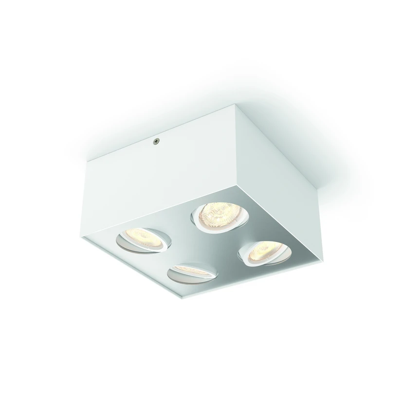 Vier schwenkbare Leuchtenköpfe mit warmweiß strahlenden LEDs sitzen in dem quadratischen LED-Deckenstrahler Box aus der myLiving-Serie von Philips. Der Strahler aus Aluminium ist dimmbar mit den meisten LED-Dimmern und verändert durch die Funktion Warmglow mit dem Dimmen seine Lichtfarbe. Je weiter das Licht gedimmt wird, desto wärmer wird es (2.700 K bis 2.000 K). Das Licht der LEDs ist besonders augenschonend und erfüllt die von Philips entwickelten EyeComfort-Kriterien.