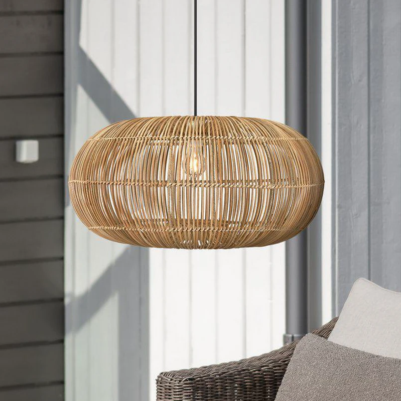 Die Hängeleuchte Zuri bringt Gemütlichkeit und einen natürliche Note auf die Terrasse oder auch den Balkon. Der Lampenschirm besteht aus handgeflochtenem Rattan, dessen Halme ineinander verschlungen sind. Abgerundet wird das Design mit einem schwarzen, robusten Kabel, das mit einem Stecker versehen macht und die Pendellampe für den Außenbereich wappnet. Die dünnen Rattanstreben sorgen für ein schönes Lichtspiel.