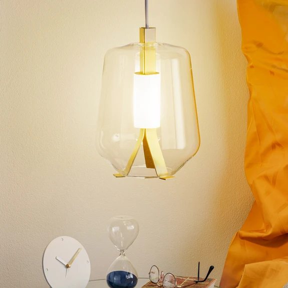 LED-Pendelleuchte Luisa S1 in Messing mit mundgeblasenem Schirm