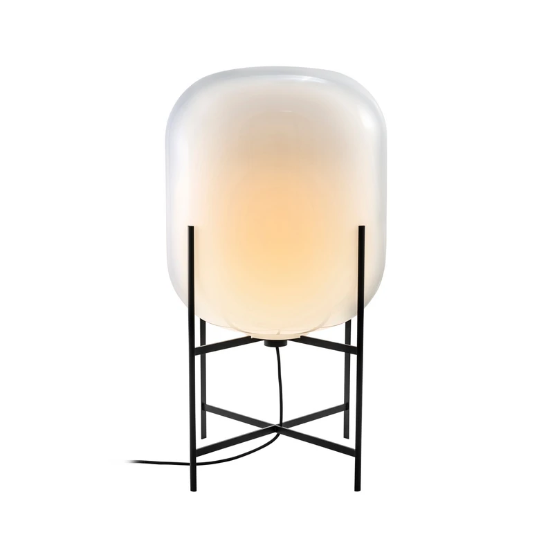 Ein schlanker Sockel umarmt eine bauchige Form. Ein industrielles Motiv, gemildert durch die sanften Rundungen des mundgeblasenen Glases. Die Stehleuchten der Serie Oda nehmen Bezug auf die gestelzten Formen von Silos, Öfen und Wassertürmen einer vergangenen Epoche.