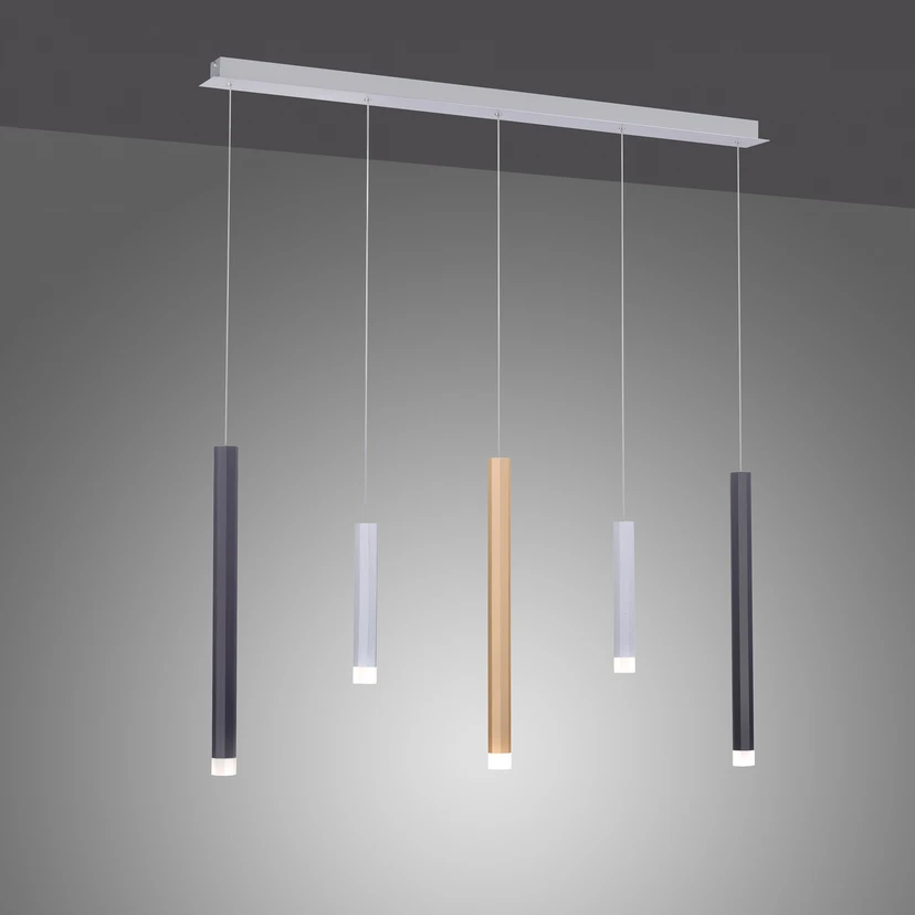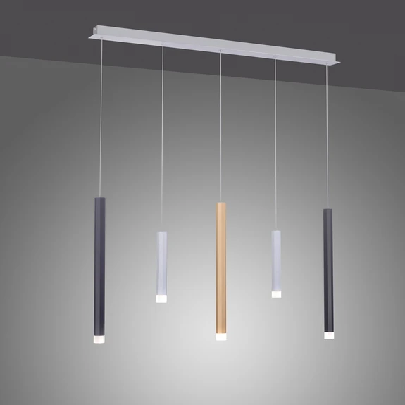 Zwei kurze und drei lange, schmal und zylindrisch gestaltete Leuchten hängen vom langen Baldachin in unterschiedlichen Abhängungen herab und erhellen beispielsweise einen langen Tisch oder eine Theke in Perfektion. In den einzelnen Leuchten wurden warmweiß strahlende LED-Boards verbaut, die sich über den Wand-Lichtschalter dimmen lassen. Diese Simply-dim-Technologie macht es möglich, die Leuchte über den vorhandenen Schalter in der Helligkeit von 100 % Lichtstärke bis zu 10 % Lichtstärke zu regulieren. Die Memory-Funktion speichert die gewählte Einstellung bis zum nächsten Einschalten bzw. so lange, bis die Auswahl geändert wird. Das puristische Erscheinungsbild der Hängeleuchte aus der Pure-Reihe ist ästhetisch und raffiniert zugleich und lässt die Leuchte zu einem Blickfang im Raum werden.