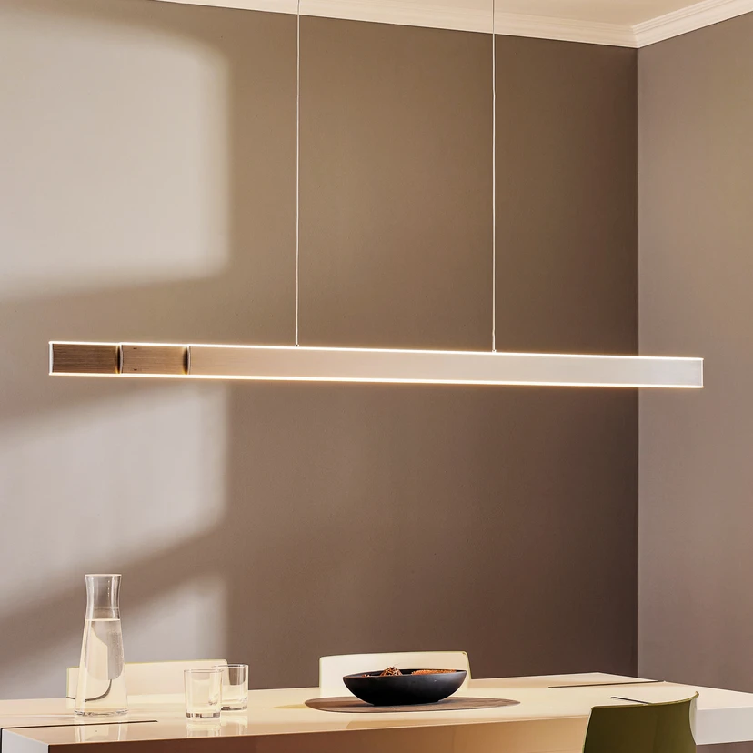 Die lang und schmal in geradliniger Form gestaltete LED-Hängeleuchte Pure-Lume passt in viele Einrichtungsstile und bietet sehr variable Beleuchtung, denn sie ist sowohl mit der CCT-Lichttechnik in der Lichtfarbe in drei Stufen einstellbar als auch stufenlos dimmbar. Zusätzlich kann die Leuchte in der Länge variiert werden, denn der aus drei schmalen Elementen zusammengesetzte Schirm ist ausziehbar. Die Lichtsteuerung des nach oben und nach unten abstrahlenden Lichts erfolgt über die oben und unten an der Leuchte integrierten Sensoren. Kurze Bewegungen im Bereich der Sensoren steuern die Lichtfarbe, ein Halten der Hand unterhalb des Sensors startet den Dimmvorgang, der endet, sobald die Hand aus dem Sensorbereich genommen wird. Die Lichtfarbe lässt sich im Bereich von warmweißer Beleuchtung bis zu universalweißem Licht einstellen und ist stufenlos dimmbar.