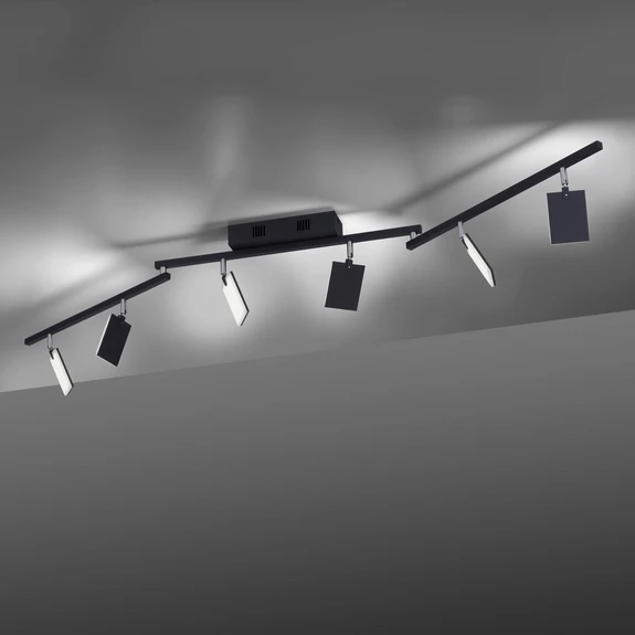 Mit offenem, reduziertem Design und vielfältigen Möglichkeiten zur passgenauen Justierung entsprechend der Gegebenheiten im Raum ist die sechsflammige LED-Deckenleuchte Mira die ideale Wahl zur umfassenden Raumbeleuchtung in modernen Umgebungen. Die aus Aluminium gefertigte Struktur setzt sich aus einem quaderfömigen Deckenkasten und drei an ihren Enden mittels Drehgelenken befestigten Armen zusammen, die in einer Linie oder in beliebigem Winkel zueinander orientiert werden können. Jeder Armabschnitt ist mit je zwei unterhalb angebrachten, rechteckigen Lichtelementen ausgestattet, die ihrerseits dreh- und schwenkbar sind, sodass das Licht der hinter satinierten Acrylabdeckungen verbauten LED-Boards auf den gewünschten Bereich gerichtet werden kann. Zur Steuerung wird eine Fernbedienung mitgeliefert, die das Dimmen und Regeln der Farbtemperatur ermöglicht, sodass Mira zu jeder Umgebung, und Tageszeit die adäquate Beleuchtung spendet. Nach dem Einschalten wird die zuletzt gewählte Einstellung wieder aktiviert (Memory-Funktion).