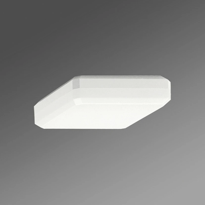Die quadratische Leuchte aus recycelfähigem Polycarbonat weist ein sehr flaches, leicht angefastes Gehäuseprofil auf, was bedeutet, dass die Kanten leicht abgeschrägt sind. Als Diffusor dient eine ebenfalls leicht angefaste, eckstabile, opale Acrylwanne, die das abstrahlende Licht der verbauten LEDs leicht diffus erscheinen lässt, so dass es nicht zur Blendung kommt.