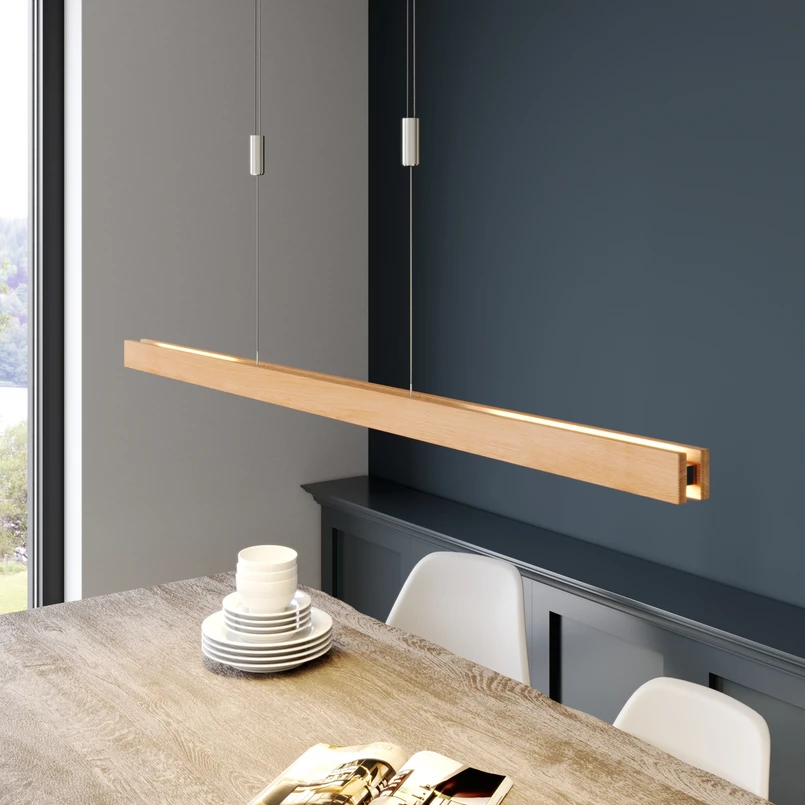 Mit der länglichen Form eignet sich Alin hervorragend für die Nutzung über einem Tisch, sei es nun im Esszimmer oder über dem Arbeitsbereich. Die integrierten, warmweiß leuchtenden LEDs bieten eine sehr effiziente Beleuchtung, die mit einer hohen Grundhelligkeit punktet. Bei Bedarf kann man einen externen Dimmer installieren bzw. den vorhandenen nutzen und somit die Leuchtkraft durch stufenlose Variation optimal an die eigenen Bedürfnisse anpassen.