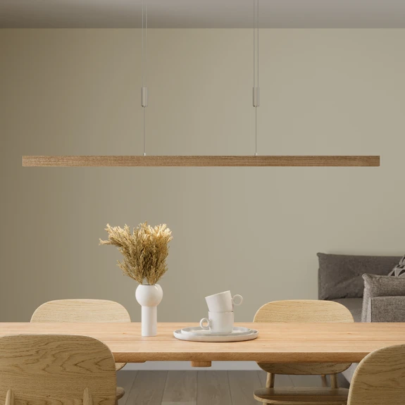 Holz ist ein Material, das sich mit zahlreichen Stilrichtungen kombinieren lässt, in kaum einer Umgebung fehl am Platz wirkt und für einen natürlichen Touch im Wohnraum sorgt. Der Trend des skandinavischen Designs greift natürliche Farben und Materialien auf und rückt Holz als ein zentralen Bestandteil in den Mittelpunkt. Die LED-Balkenpendellampe Nora wurde aus massivem Eichenholz gefertigt und folgt damit dem Wohntrend des skandinavischen Stils.