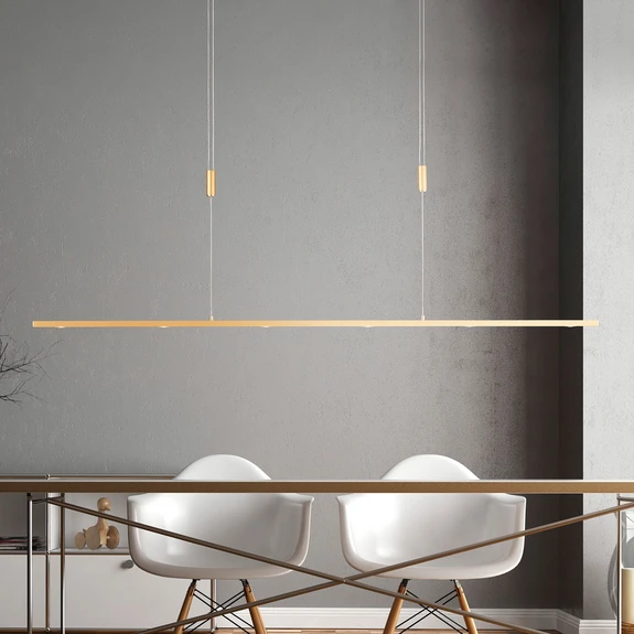 Höhenverstellbare, in Deutschland gefertigte LED-Pendellampe Tolu in schlankem Design mit edler Messingoberfläche, extern dimmbar
