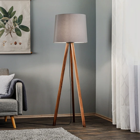 Alos überzeugt mit einer stilvollen Optik und ist eine jener Stehleuchten, die sich aus einem Stoffschirm und einem dreibeinigen Holzgestell zusammensetzen. Dabei ist der Lampenschirm, dessen Grundlage eine B1-Trägerfolie (schwer entflammbar) ist, mit einem grafitgrauen Chintzstoff belegt worden und das Gestell besitzt drei aufwendig bearbeitete Holzbeine, die ihr abschließendes Finish mit hochwertigem Klarlack erhalten kann. Das hat zur Folge, dass man die natürliche Maserung des Holzes noch komplett erkennen kann und nichts von der Schönheit der Nussbaumoberfläche verlorengeht.