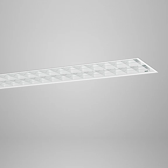 Die LED-Halleneinbauleuchte Gym 2 besteht aus Stahlblech in Weiß. Sie eignet sich für den Einbau in Decken mit Großflächen-Gipskarton, Holzpanel, Metallpanel oder Mineralfaserplatten, wie sie beispielsweise in Turnhallen und Mehrzweckhallen zu finden sind. Das Lamellenraster ist mit Verstärkungsstäben und zusätzlich mit Ausbrechöffnungen für Netzleitungen versehen. Die mittlere Lampe ist auf L1, die äußeren Lampen sind auf L2 verdrahtet. Es sind drei Betriebsgeräte enthalten.