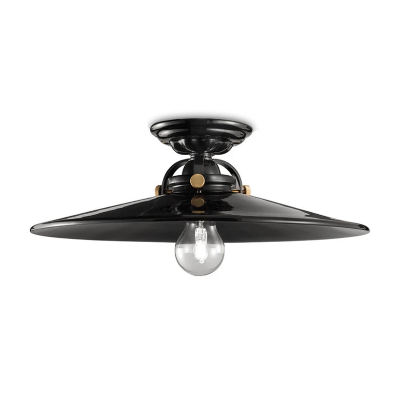 Diese Deckenleuchte C105 schafft durch ihre starken Farben und ihre glänzenden Oberflächen ein Profil der Gegenwart, wobei die Erinnerung an einen Stil der Vergangenheit erhalten bleibt. Sowohl der Lampenschirm als auch der Baldachin sind aus Keramik gefertigt. Die Deckenleuchte ermöglicht mit ihrem glänzenden Finish, dem Verzicht auf unnötige Verzierungen sowie den Tragschrauben mit goldfarbenem Finish den Einsatz in stilistisch unterschiedlichen Umgebungen.