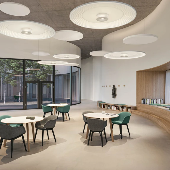 Mit brilliantem Direktlicht, topmodernem Design und willkommener Zusatzfunktion begeistert die Hängeleuchte Vior acoustic - gerade in Empfangs- und Aufenthaltsbereichen sowie geräumigen Büros. Ihre LED-Lichtquelle liegt im Zentrum integriert; die Abstrahlung erfolgt durch eine ausgeklügelte, patentierte Lichtlenkung mittels Linse und Microfacetten-Reflektor, sodass eine Minimierung der Blendwirkung erzielt wird. Die ausladende, runde Scheibe prägt nicht nur das Erscheinungsbild der Pendelleuchte, sondern sorgt mit schallabsorbierenden Eigenschaften für eine Optimierung der Raumakustik. Funktion und Design gehen hier Hand in Hand; die ringförmigen Abstufungen erinnern an sich ausbreitende Schallwellen. Das weiße Paneel besteht aus Polyesterfasern, die zu einem Großteil aus recycelten PET-Flaschen hergestellt und ohne chemische Bindemittel verarbeitet werden.