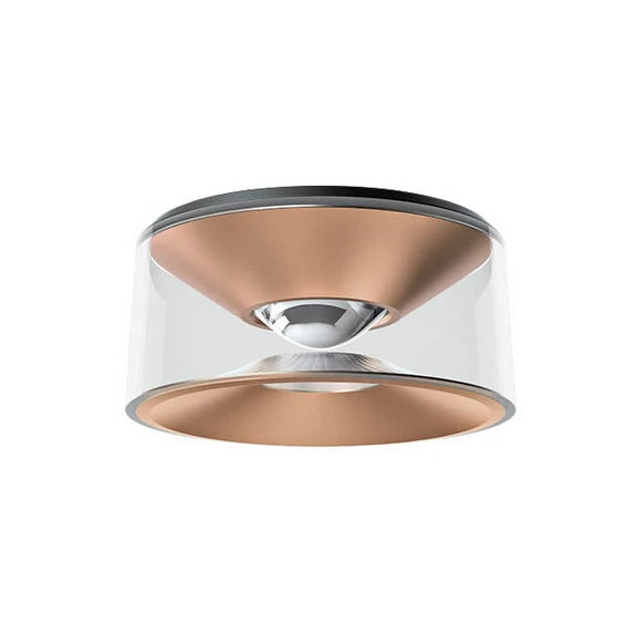 Mit brilliantem Licht sowie elegantem und zeitgemäßem Design bereichert die Deckenleuchte Vior Wohn-, Aufenthalts- und Geschäftsräume. Sogar in Bädern und Spa-Bereichen kann sie dank des Spritzwasserschutzes zum Einsatz kommen. Der Aufbau in flacher Zylinderform besteht aus einer Basis aus Aluminiumdruckguss in roségoldener Optik und einer seitlichen Abdeckung aus transparentem PMMA-Kunststoff. Dank der ausgeklügelten, patentierten Lichtlenkung mittels Linse und Microfacetten-Reflektor werden ein blendarmes Direktlicht sowie eine angenehme indirekte Beleuchtung per Deckenaufhellung erzielt. Der Anschluss erfolgt direkt an 230 V, dabei kommt die LED-Deckenlampe ohne Betriebsgerät aus.