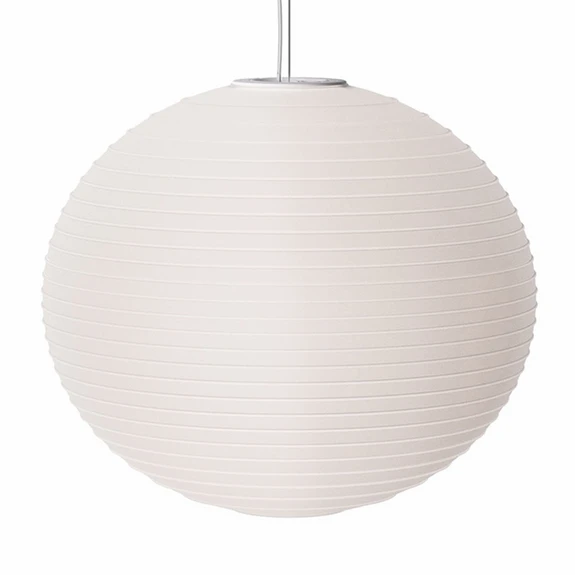 Der mundgeblasene Glasschirm mit seinen feinen, waagrechten Linien lässt an eine fernöstliche Laterne aus Papier erinnern. Mit filigranen Seilen ist der Schirm mit dem Deckenbaldachin verbunden. Mit einem selbstgewählten, dimmbaren Leuchtmittel, hier kann gerne auf eine energiesparende LED-Lichtquelle zurückgegriffen werden, erstrahlt das Muster der Leuchte mit indirektem, blendfreien Licht und verbreitet eine gemütliche Stimmung.