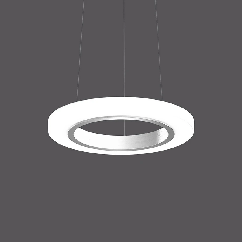 Das seidenmatte, mundgeblasene Opalglas des Diffusors, der an der Außenseite zylinderartig anbaut, ist mit einem inneren Ring aus natürlich eloxiertem Aluminium kombiniert. Dieses Design lässt die Hängeleuchte Ring of Fire besonders modern und elegant wirken. Das Licht der integrierten LEDs wird durch das Opalglas gleichmäßig gestreut. Der Lichtoutput lässt sich bei Bedarf über externe Dimmer via DALI regeln.