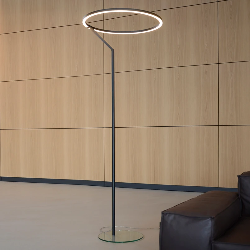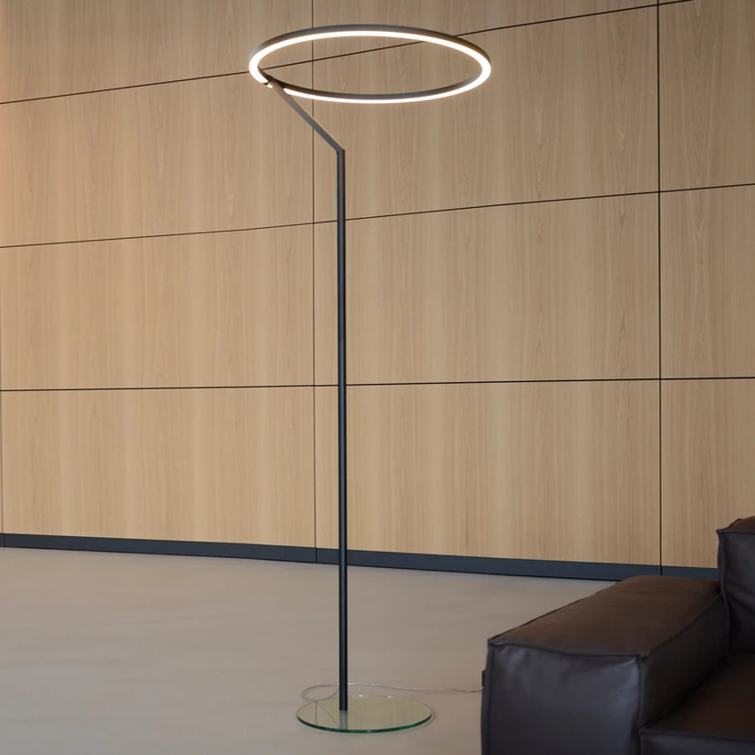 Als Basis für die LED-Stehleuchte Insospeso Floor dient ein runder Fuß aus Sicherheitsglas mit satinierter Kante. Das Gestell besteht aus robustem Aluminium und ist 2 cm stark. Im oberen Bereich ist es nach hinten abgewinkelt und hält den mit hochwertigen LEDs ausgestatteten Ring. Die Abdeckung der LEDs ist opalweiß satiniert, so dass die Insospeso Floor trotz direkter Lichtabgabe nicht blendet.