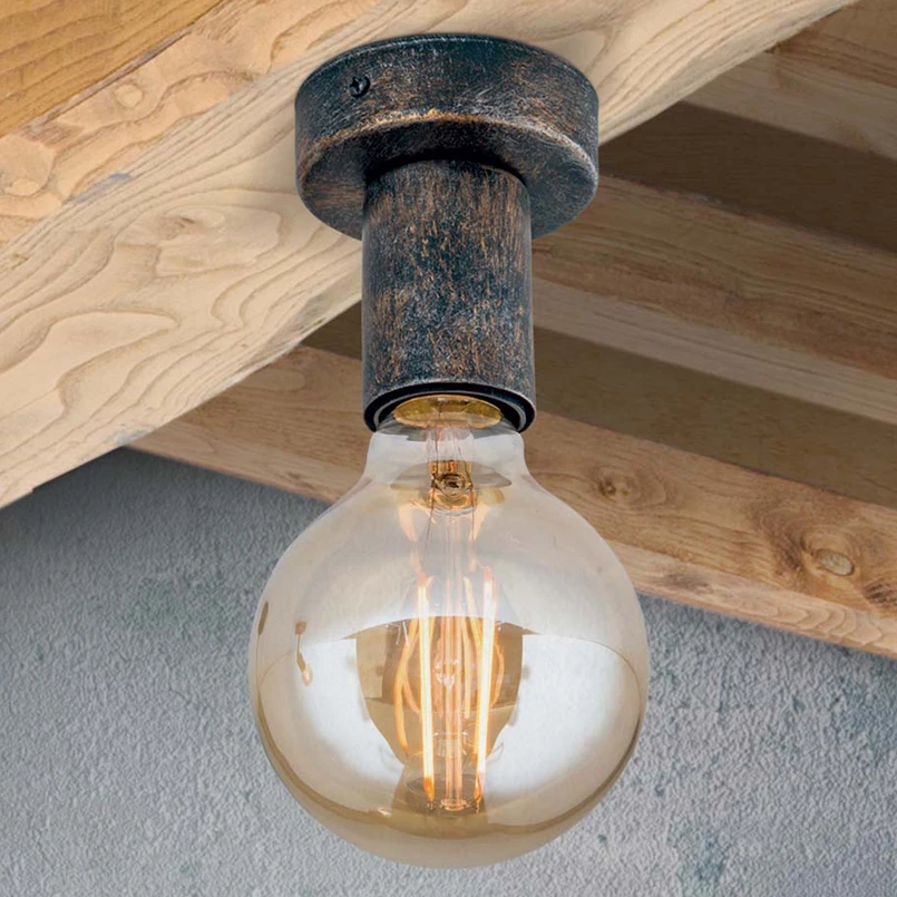 Das Design der Deckenleuchte Rati begeistert Puristen sowie Fans des Vintage-Stils gleichermaßen. Ihr Äußeres ist nämlich auf die Deckenbefestigung und die Lampenfassung bzw. die Kaschierung der Lampenfassung reduziert. Noch dazu sind diese Metallelemente mit einer Lackierung in rostbrauner Optik versehen und verbreiten so einen rustikalen Charme. Dieser wird noch verstärkt, wenn ein Vintage-Leuchtmittel eingesetzt wird.