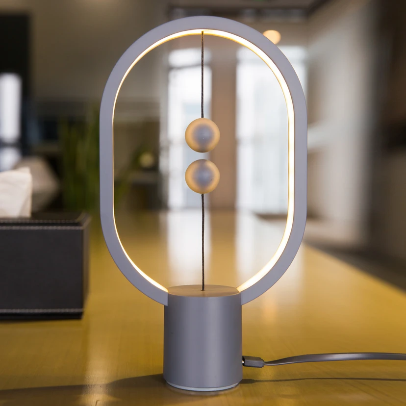 Heng Balance Mini ist eine außergewöhnliche LED-Tischleuchte, die warmweißes Licht durch die innen im ovalen Lichtelement verbauten LEDs abstrahlt und damit ein blendfreies und gemütliches Licht spendet. Entgegen anderer Tischleuchten ist sie nicht mit einem herkömmlichen Schalter ausgestattet, sondern wird über die im Oval sitzenden Kugeln gesteuert. Die untere Kugel wird angehoben, so dass sie von der oberen Kugel magnetisch angezogen sowie vom unteren Zug in Position gehalten wird, in der Luft stehen bleibt und das Licht einschaltet.